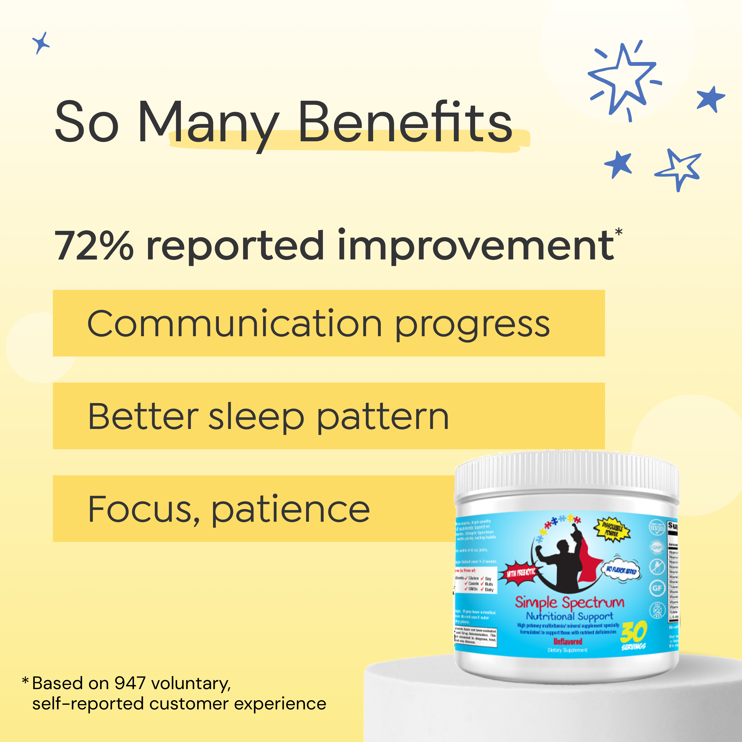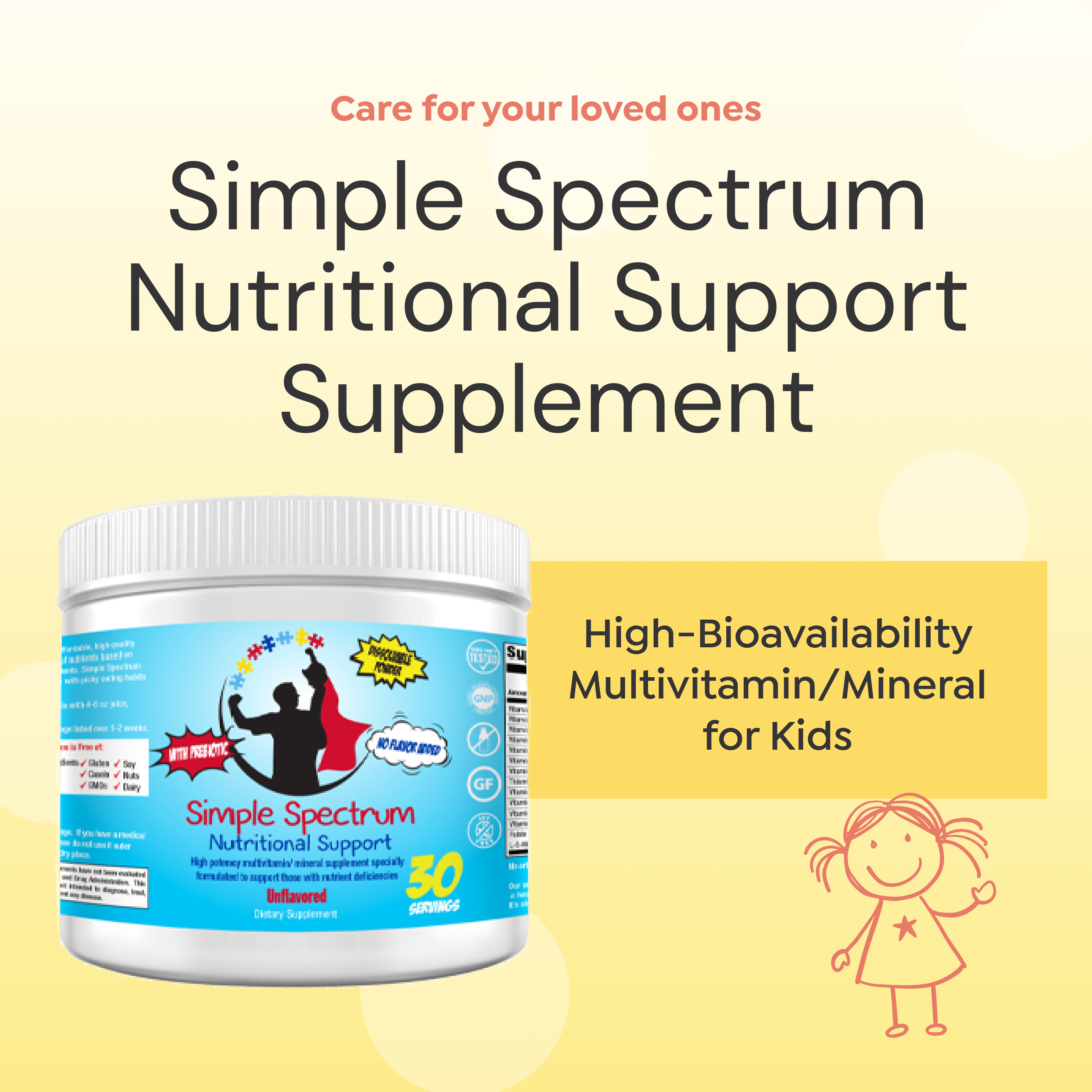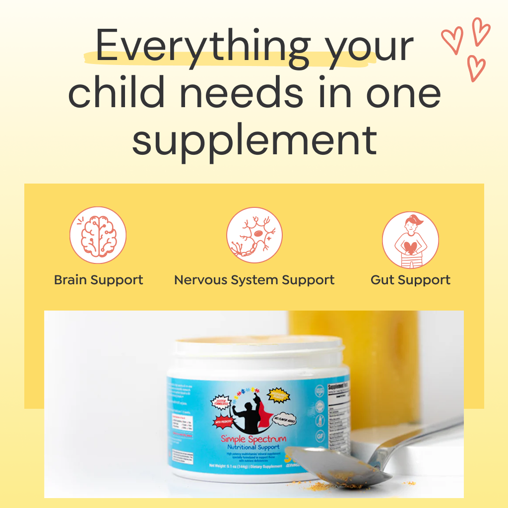 Simple Spectrum was designed with our kids with sensory needs in mind and is an unflavored dissolvable powder without gluten, casein, added sugar, soy, binding agents, artificial colors, preservatives, GMOs and dairy. The highest quality vitamins, minerals, and other nutrients in the best forms - It really is quite simple.