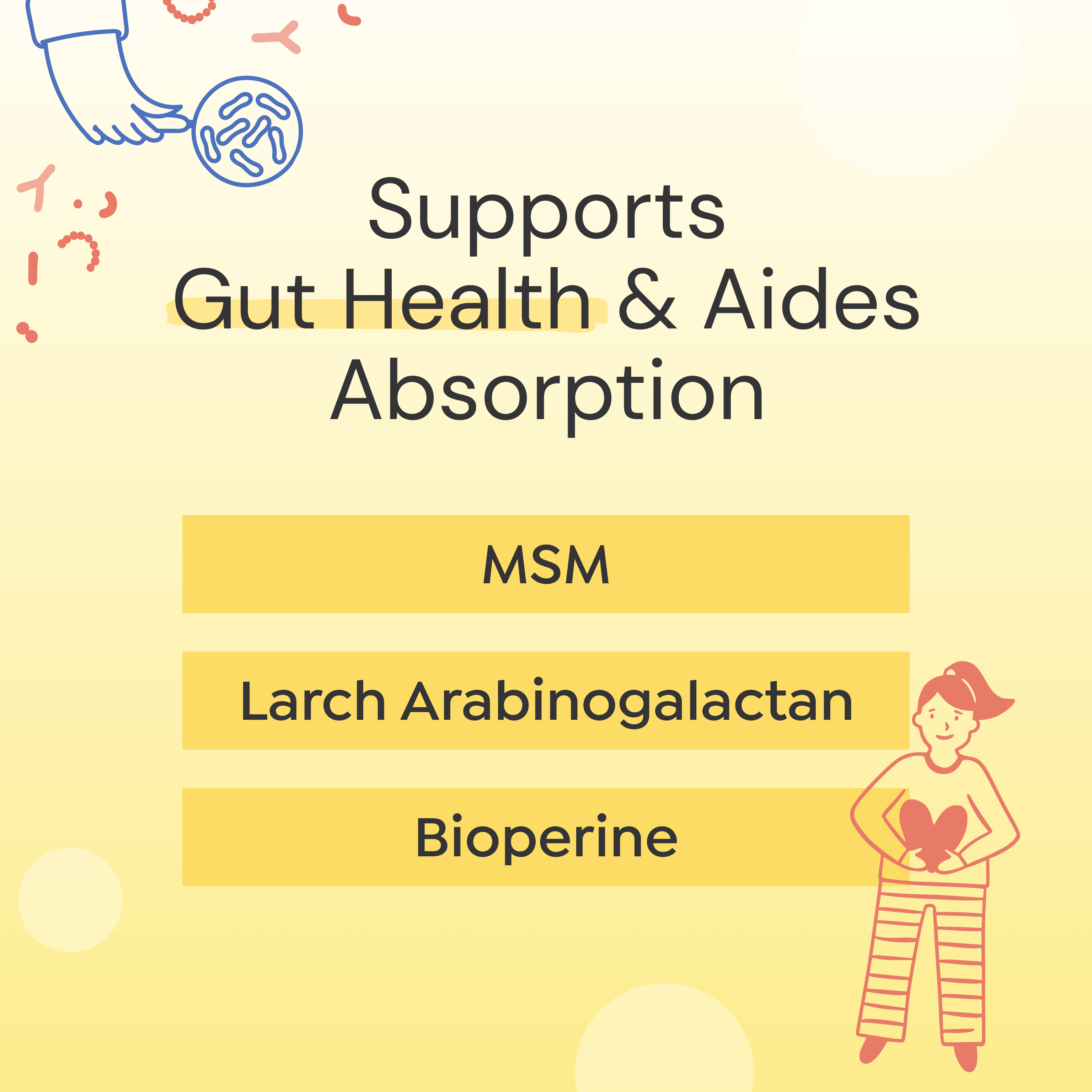 - Larch Arabinogalactan: (Prebiotic) Supports healthy gut bacteria.